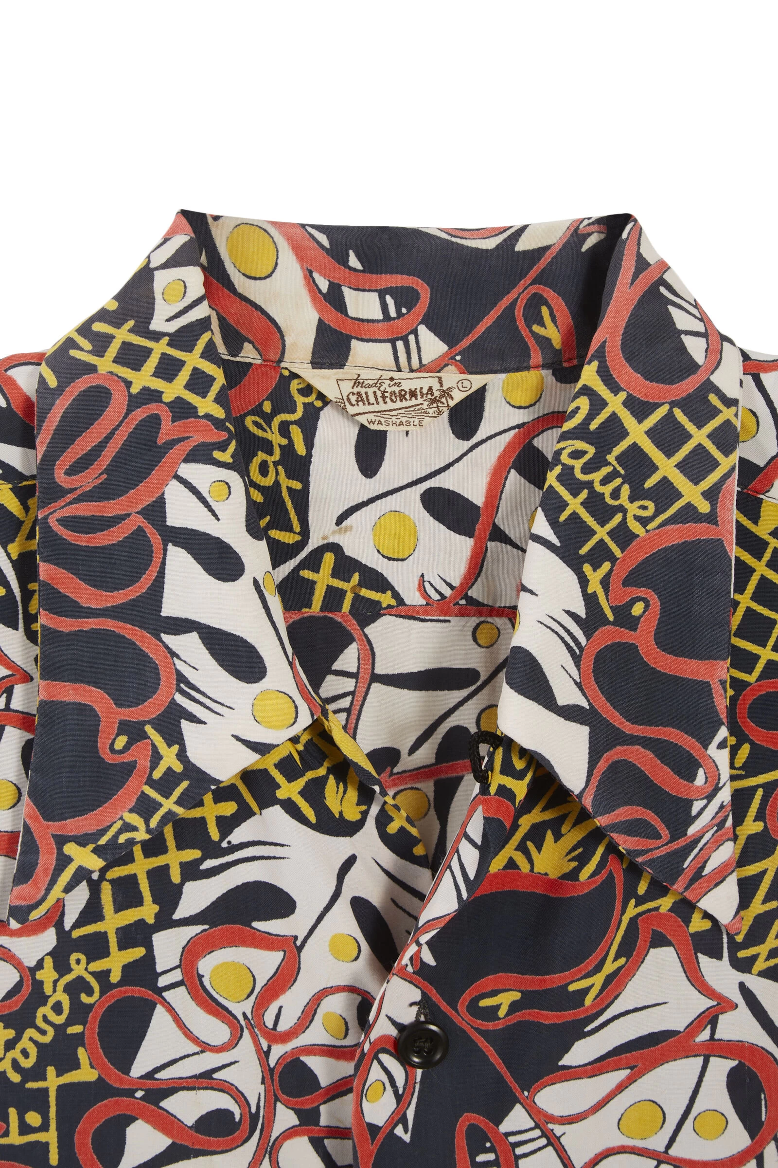 Vintage Hawaiian shirt featuring a multicolor allover pattern that includes leaves, palm trees and abstract stripes.