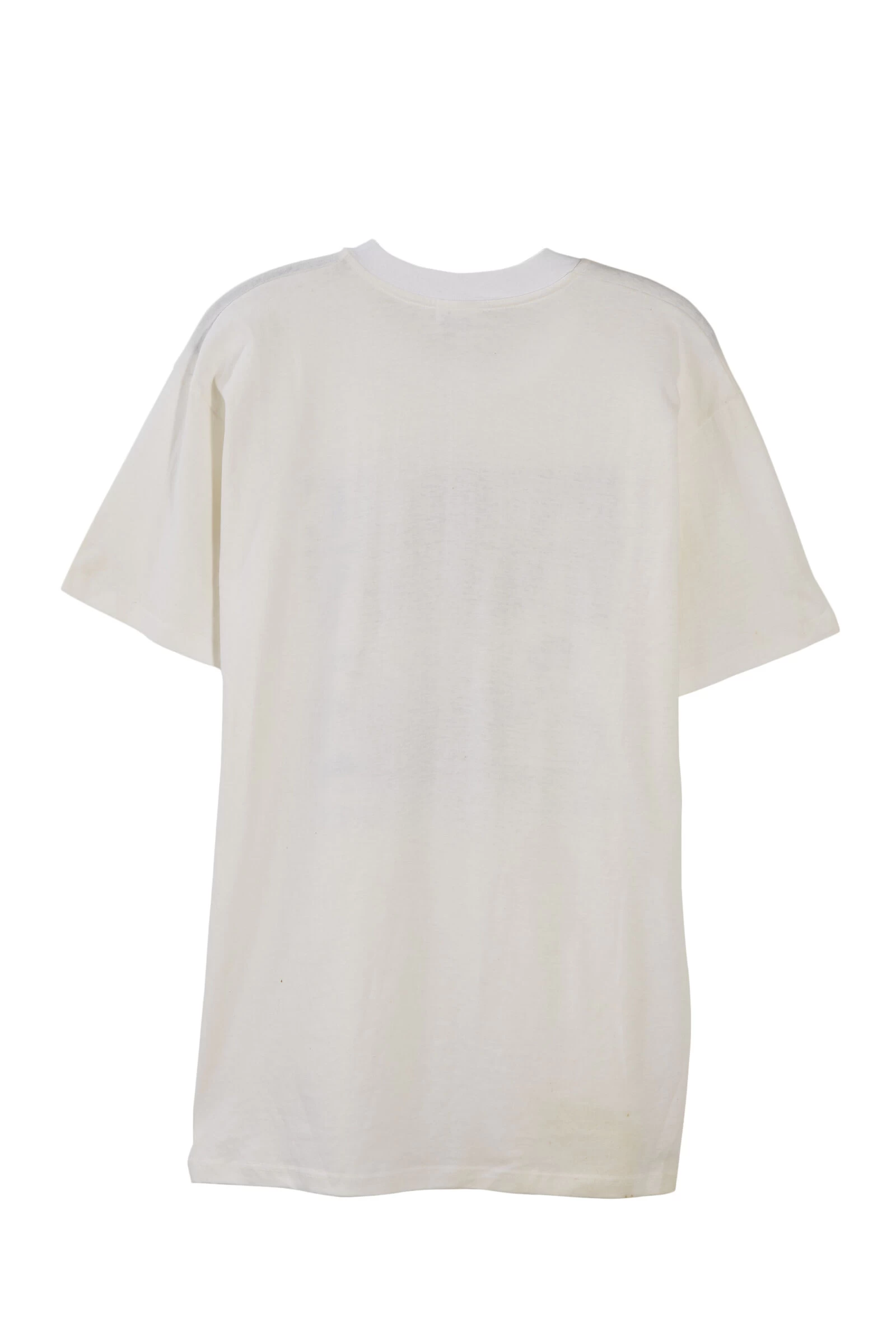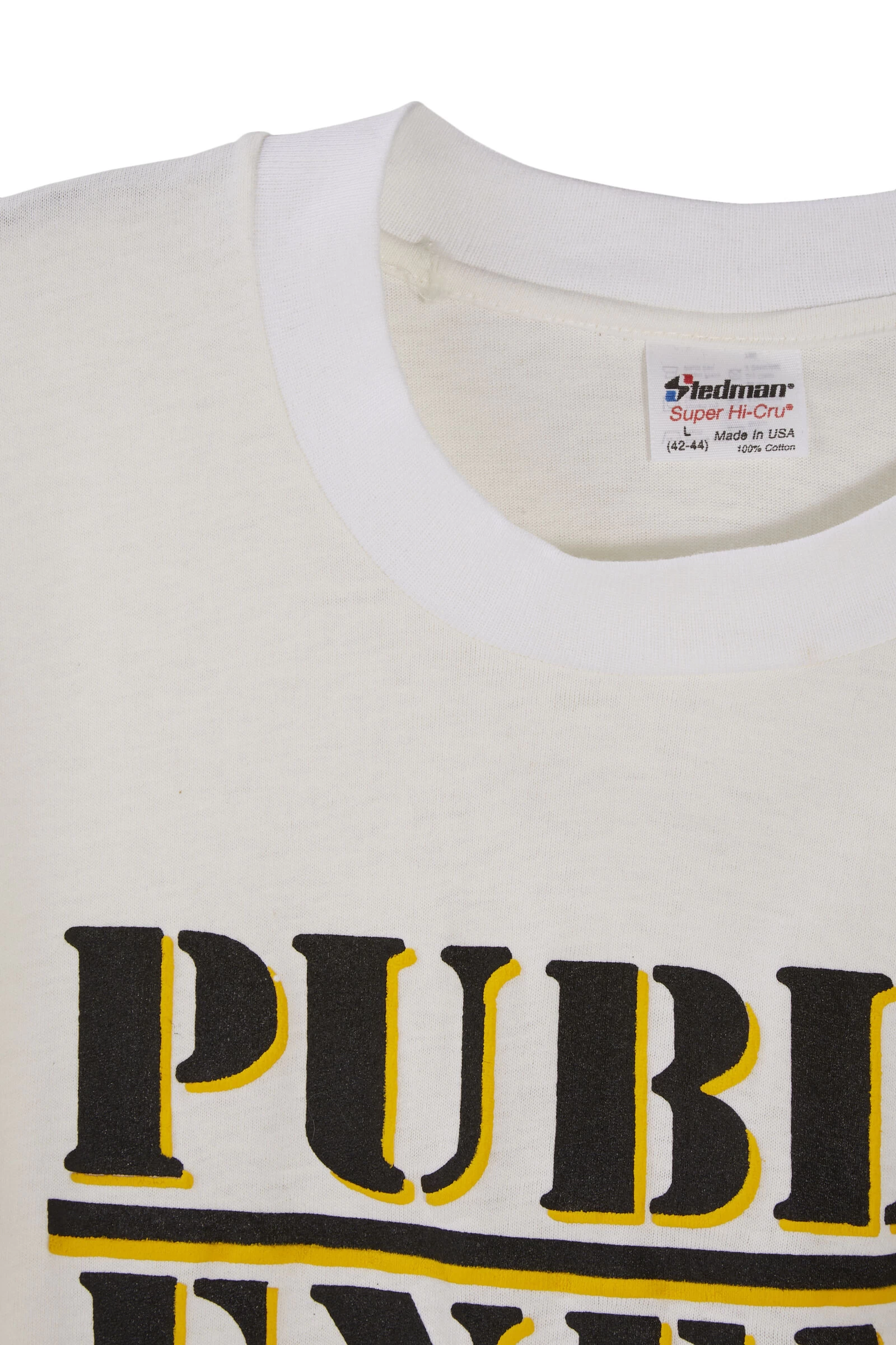 Public Enemy white “Fight The Power” vintage tee. Public Enemy is a New York based hip-hop band, in 1989 the group released their controversy hit “Fight The Power”. This tee features the band name, the name of the song and a picture of the brand.