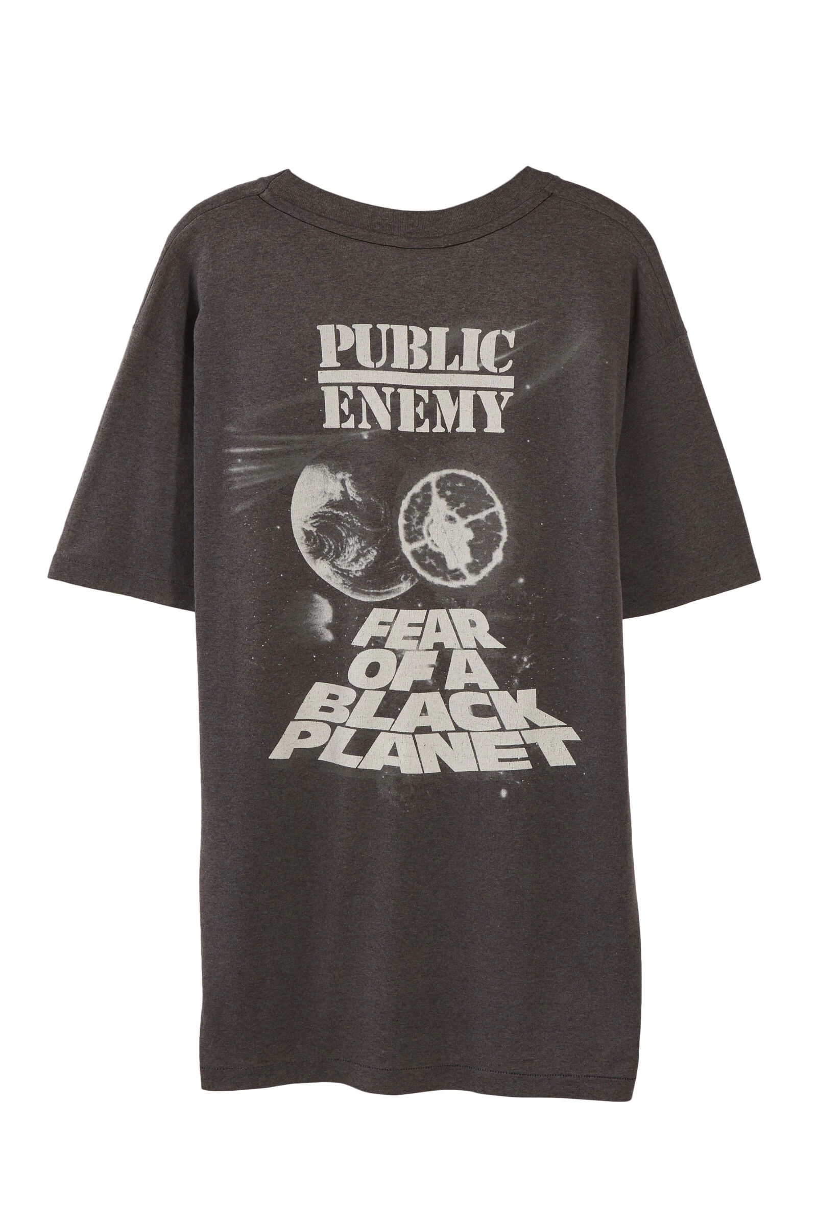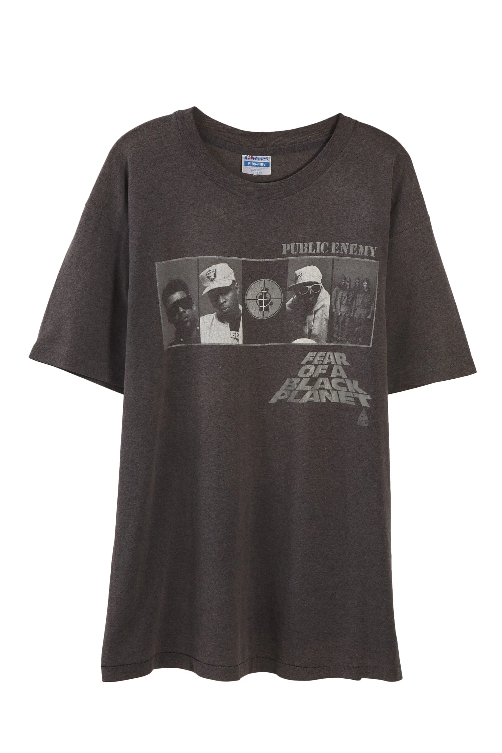 1991 Public Enemy grey “Fear Of A Black Planet” vintage tee. This vintage tee from the group’s third album features a picture of the group. Also featuring the name of the group and the name of the album on the front and back of the tee.