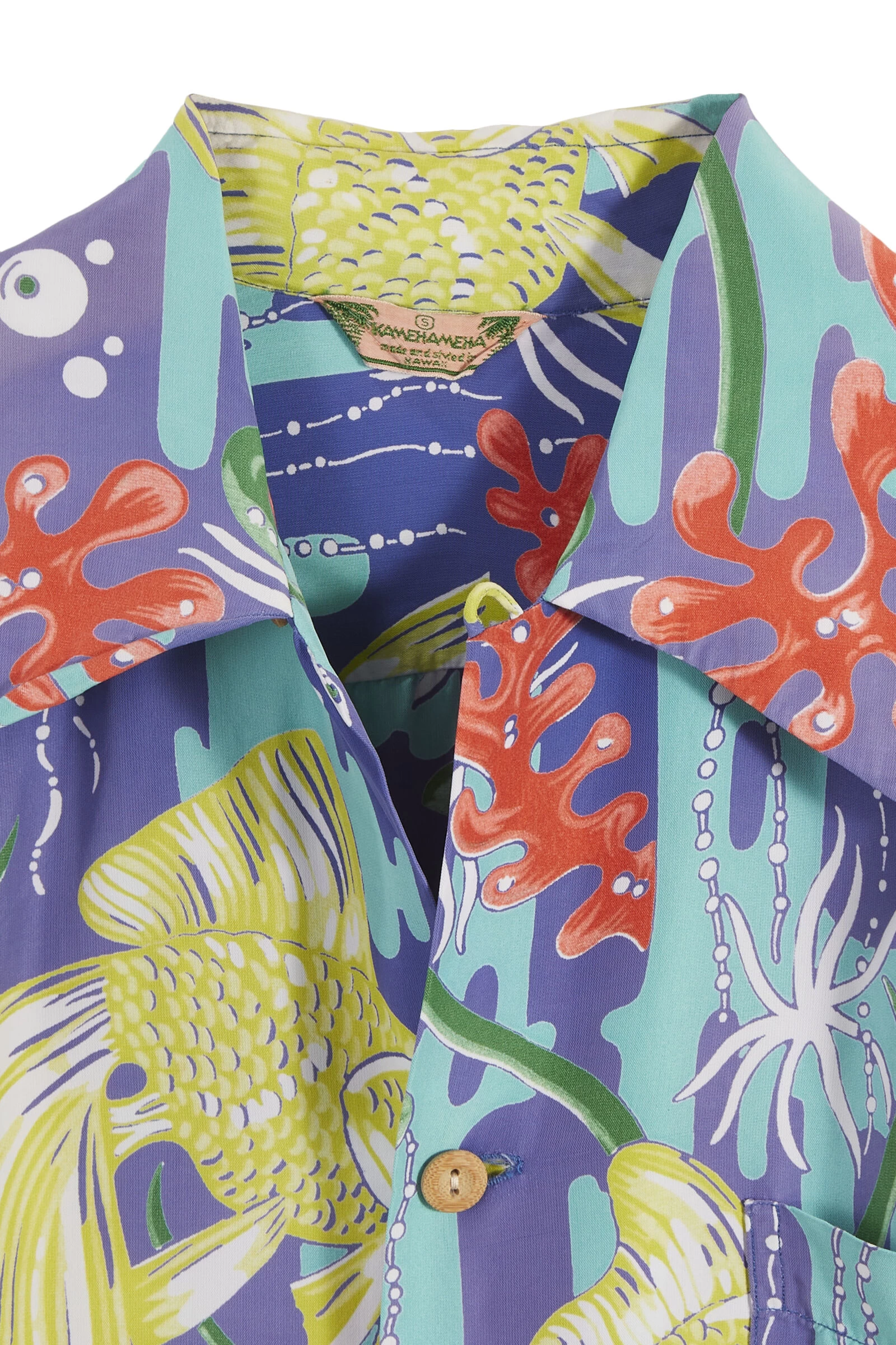 Crafted in mesmerizing imagery, this vintage Kamehameha Hawaiian shirt from the 1950s is rendered in an ombre purple along with multicolored floral and fish.