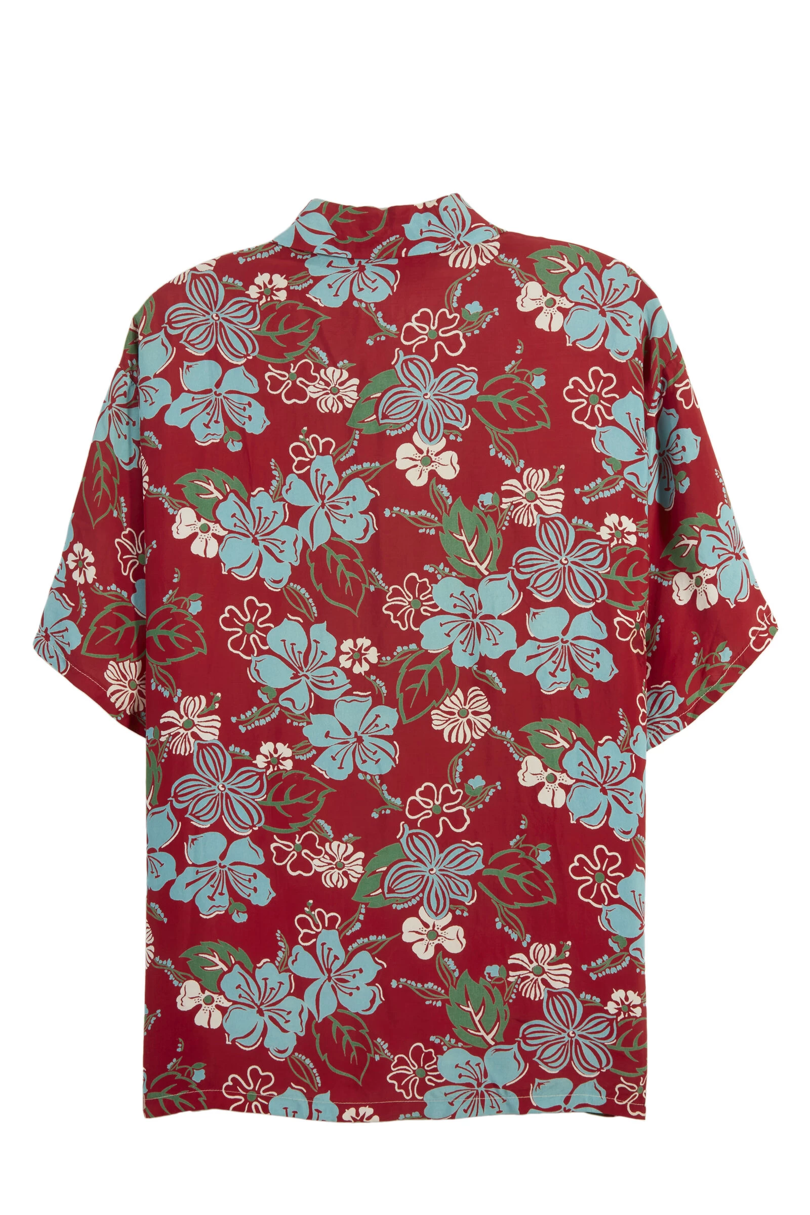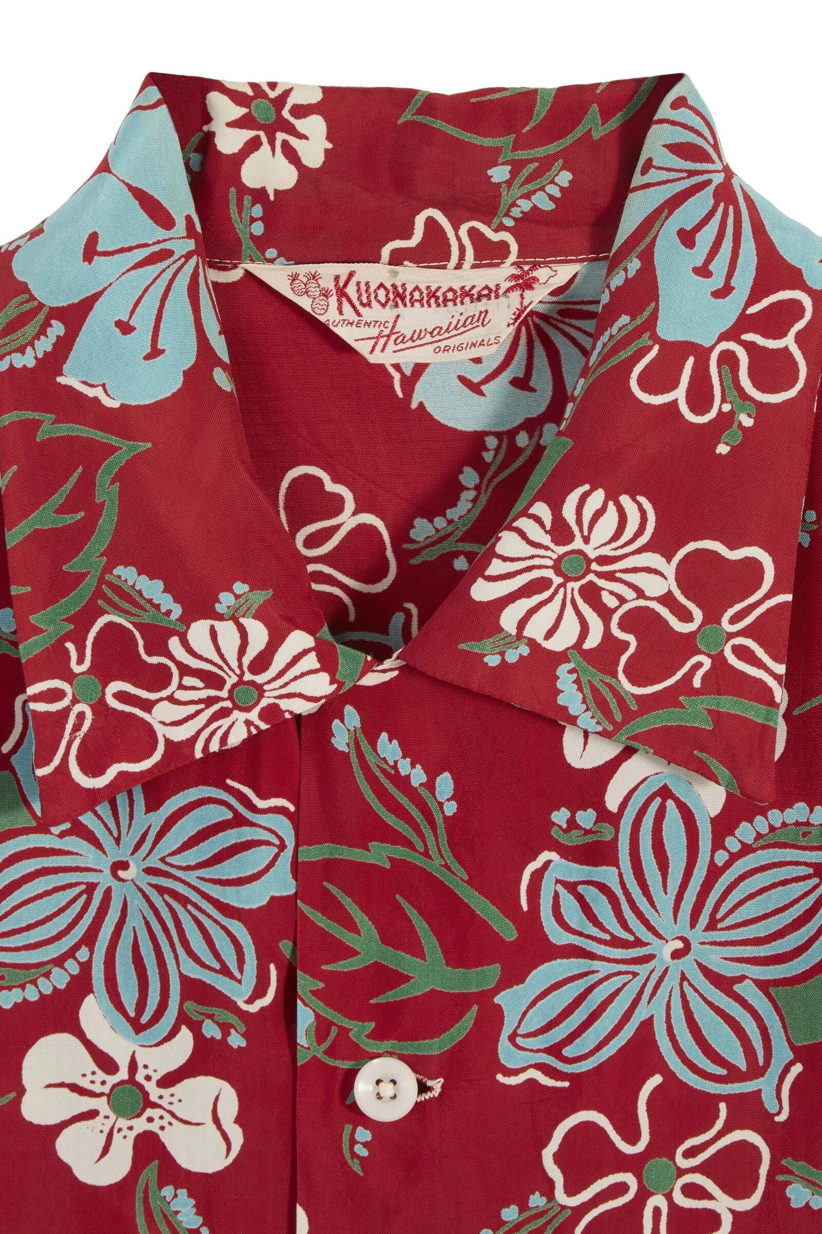 A Kuonakakai authentic Hawaiian original, this shirt features blue, white, and green floral prints on a red lightweight material.