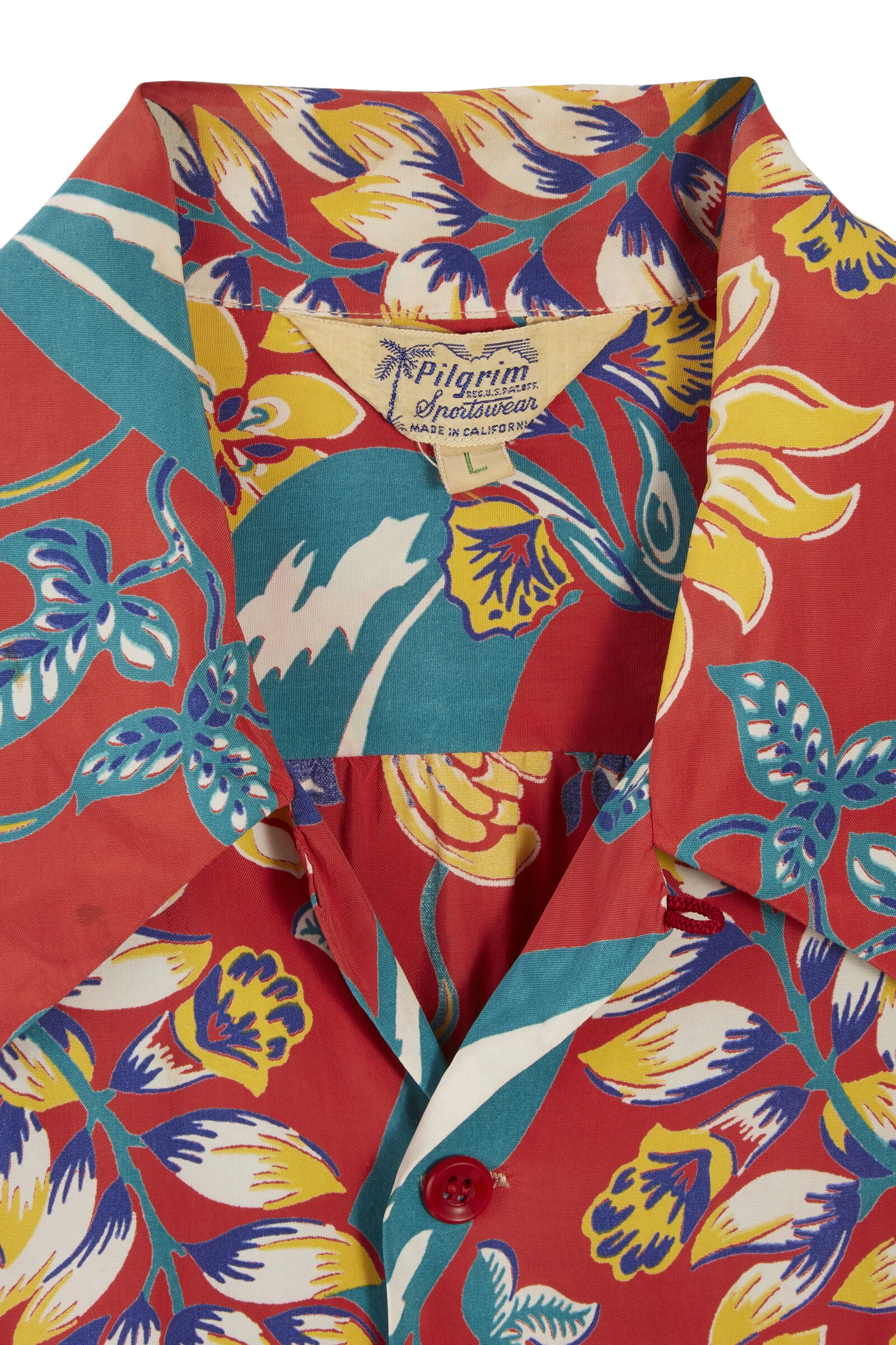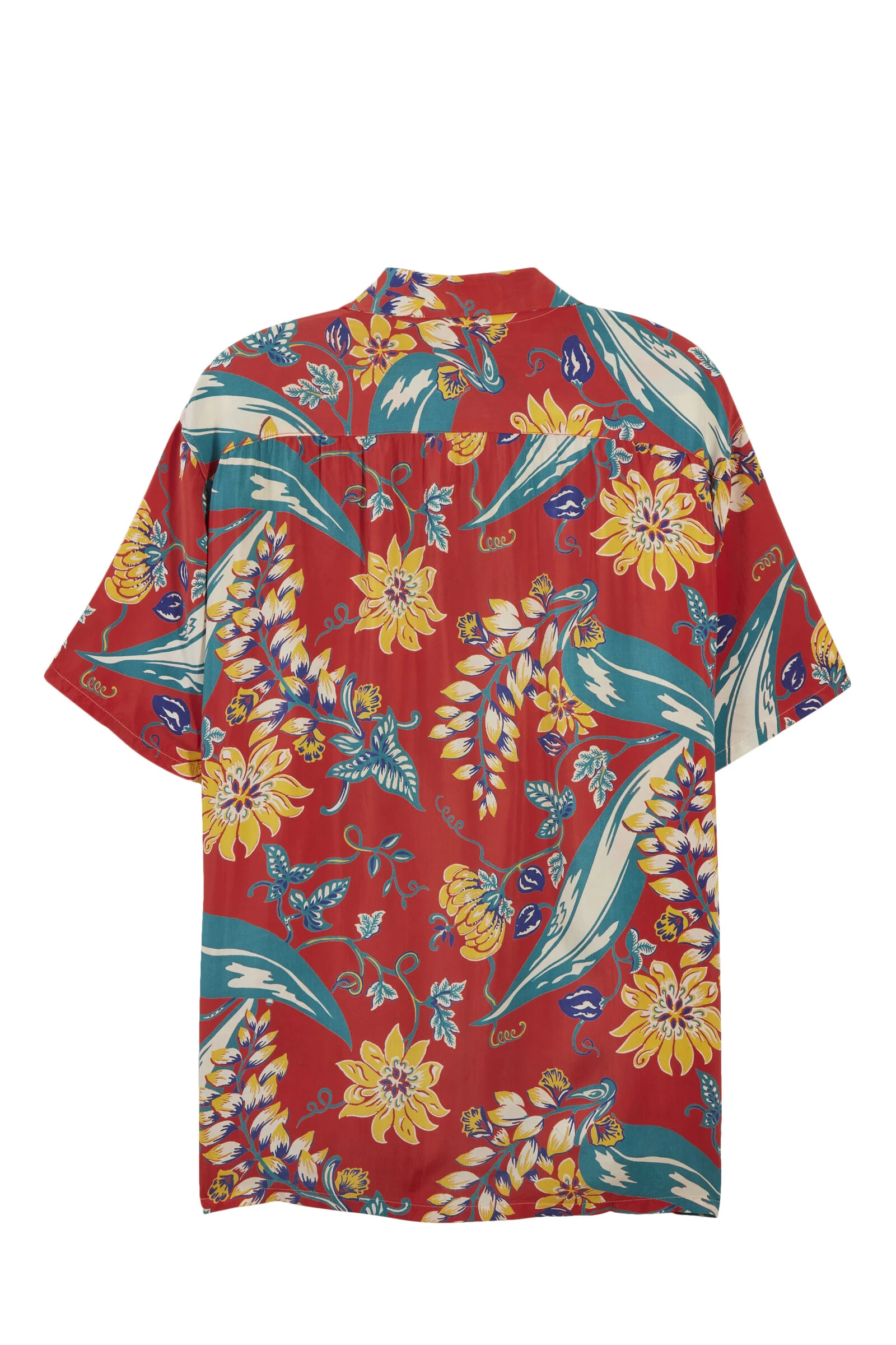 Pilgrim Sportswear classic Hawaiian shirt in a faded red color and an allover floral pattern.