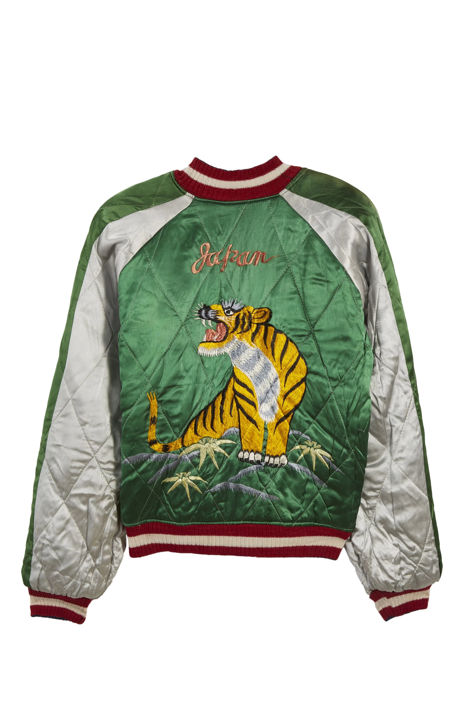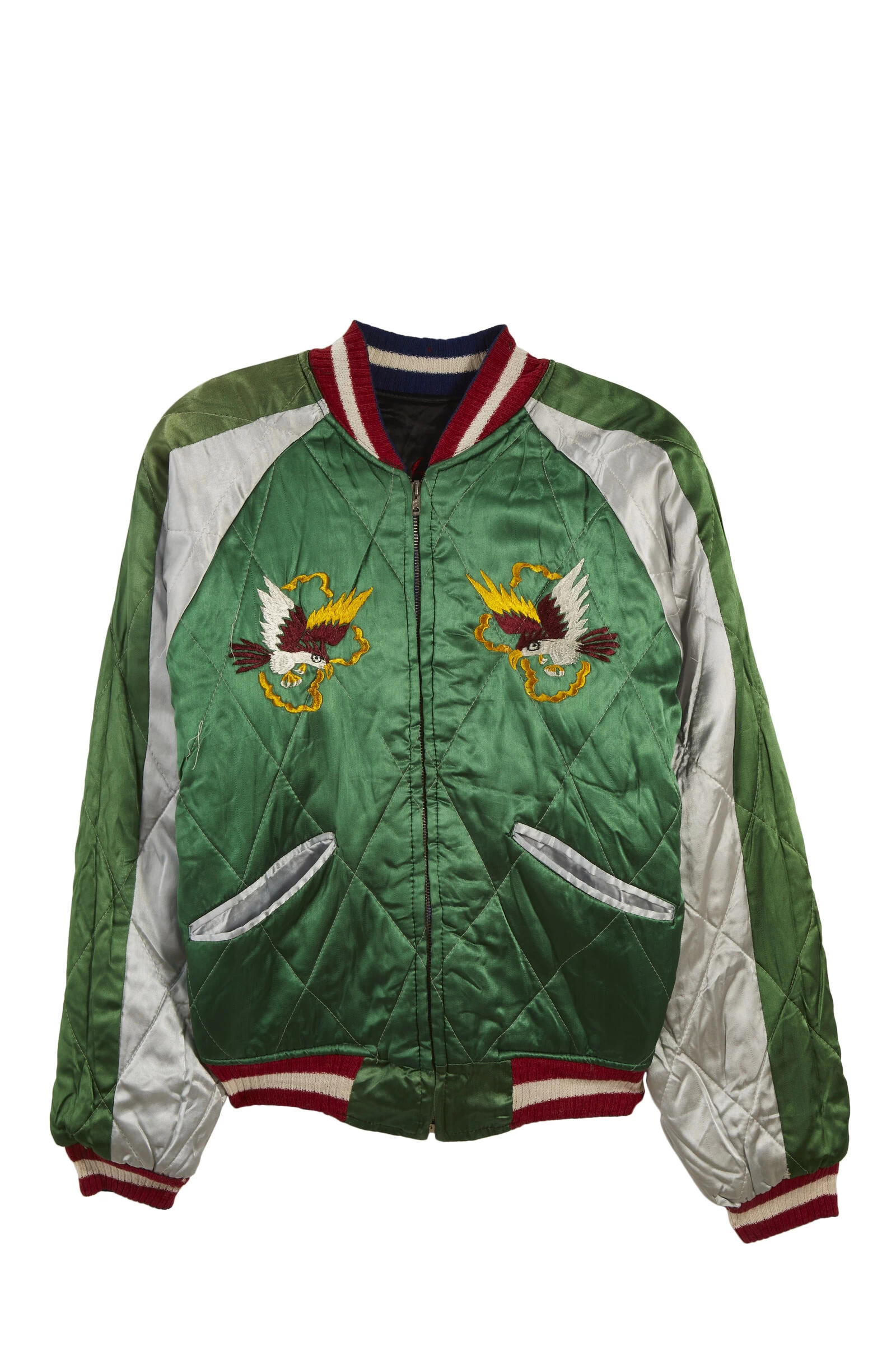 Vintage reversible satin souvenir jacket featuring black/silver satin with eagle embroidery. Including a reverse side rendered in a quilted silver/green satin and embellished with tiger and eagle embroidery.