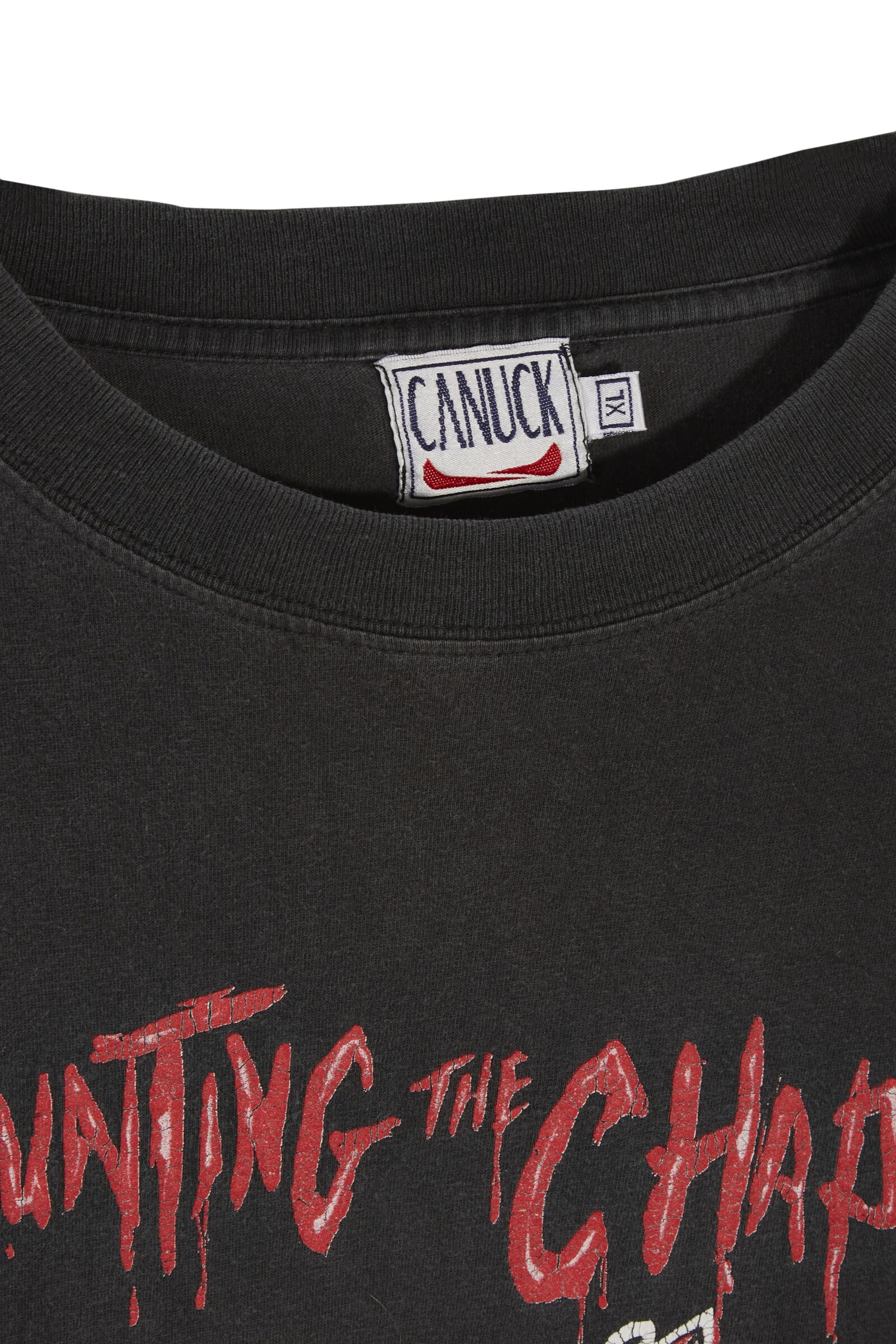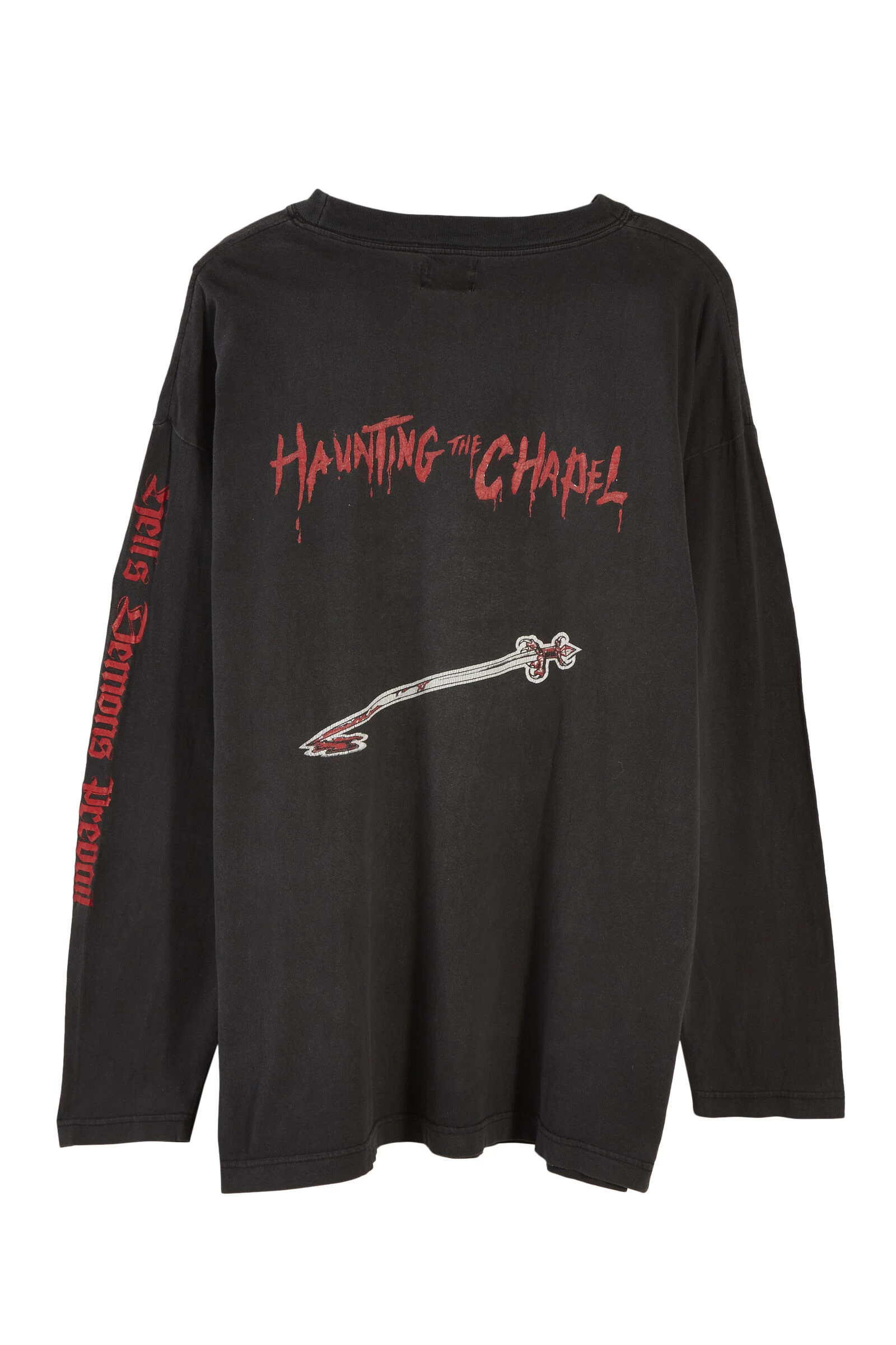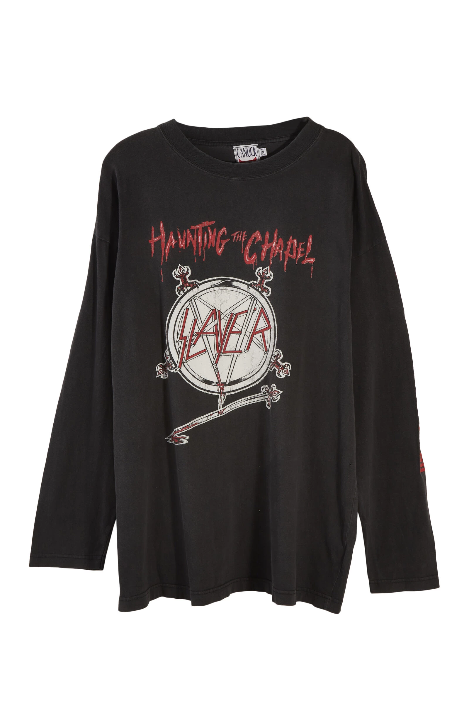 1990’s black Slayer ‘Haunting The Chapel’ album tee. This vintage tee features the name of American thrash metal band ‘Slayer’, the name of their album ‘Haunting The Chapel’, along with the album’s artwork on the front and back of the tee.