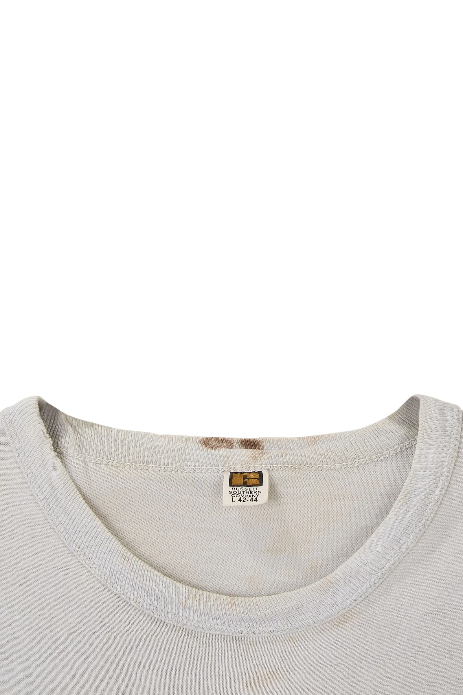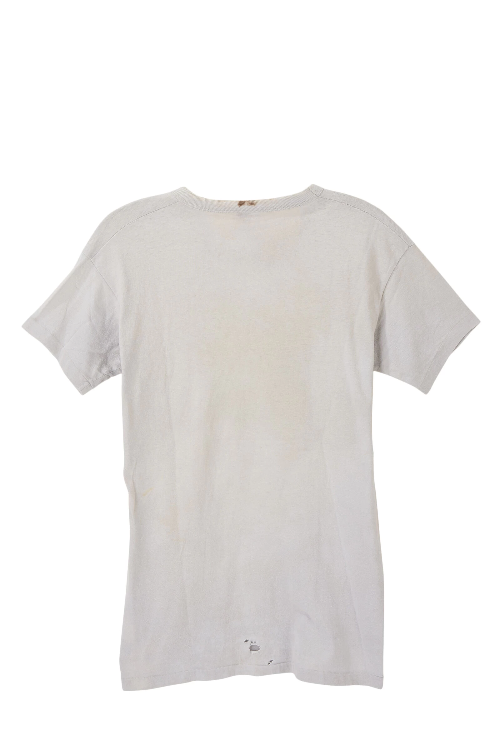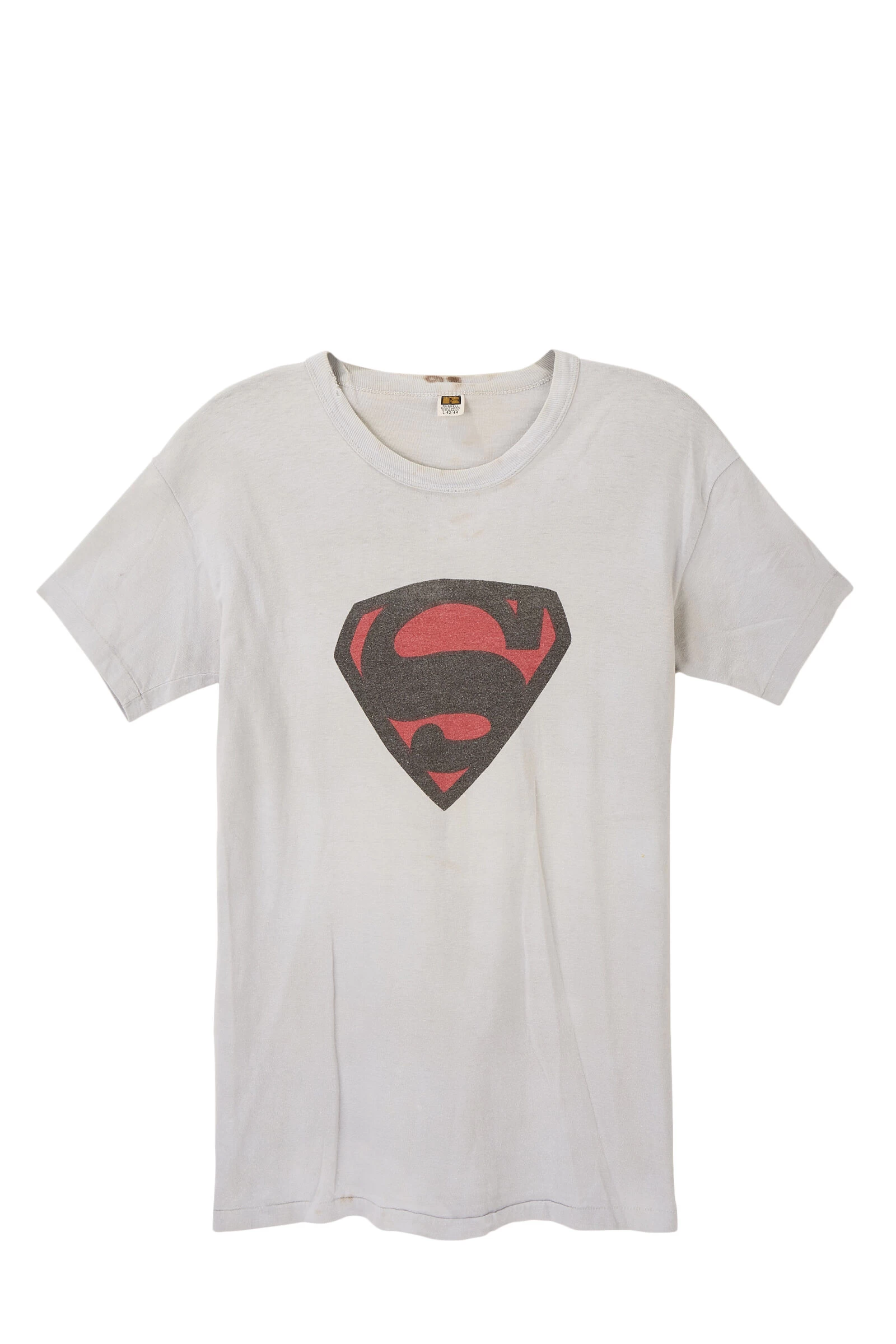 1960s Superman logo vintage tee. The iconic Superman logo is featured here in red and black and contrasts beautifully with the light blue coloring of the shirt.