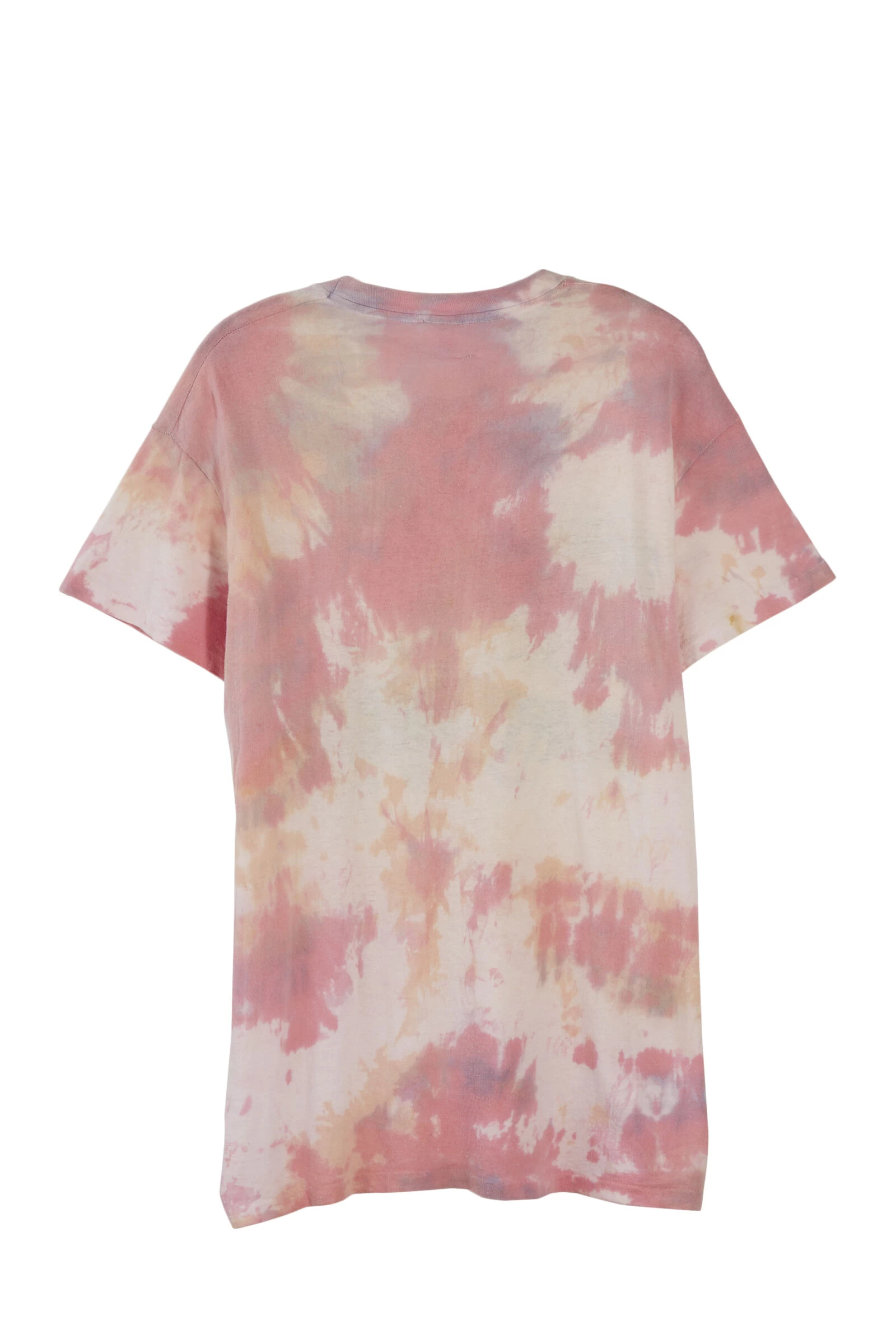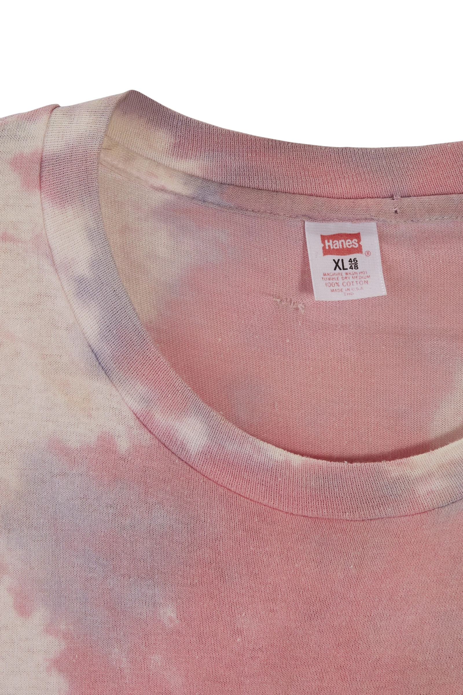1975 tie-dyed Grateful Dead vintage tee. Covered in pink tie-dyed print, featuring a graphic picture of the band and their band logo.
