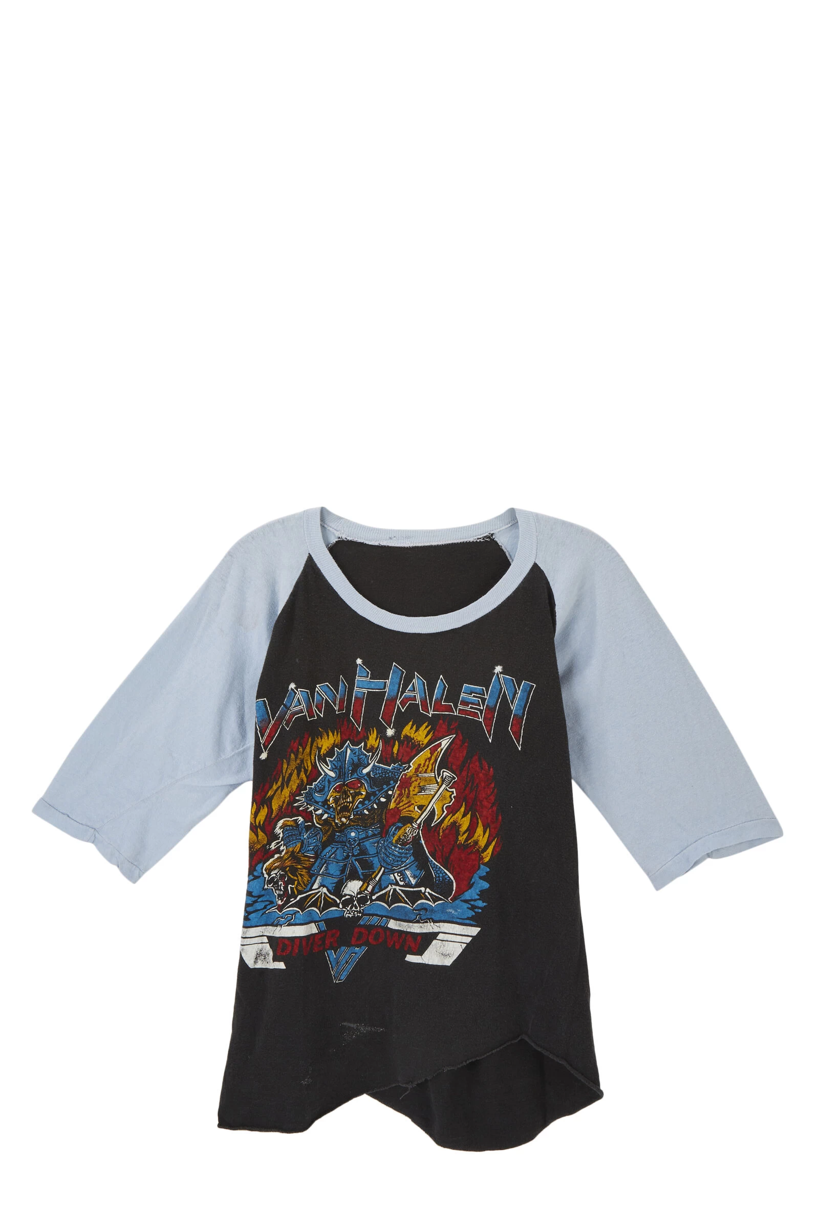 1982 Van Halen baseball style tour tee promoting their album Diver Down from the ‘Hide Your Sheep’ Tour. The front graphic features demonic and hellscape imagery while the back features graphic imagery of the band.